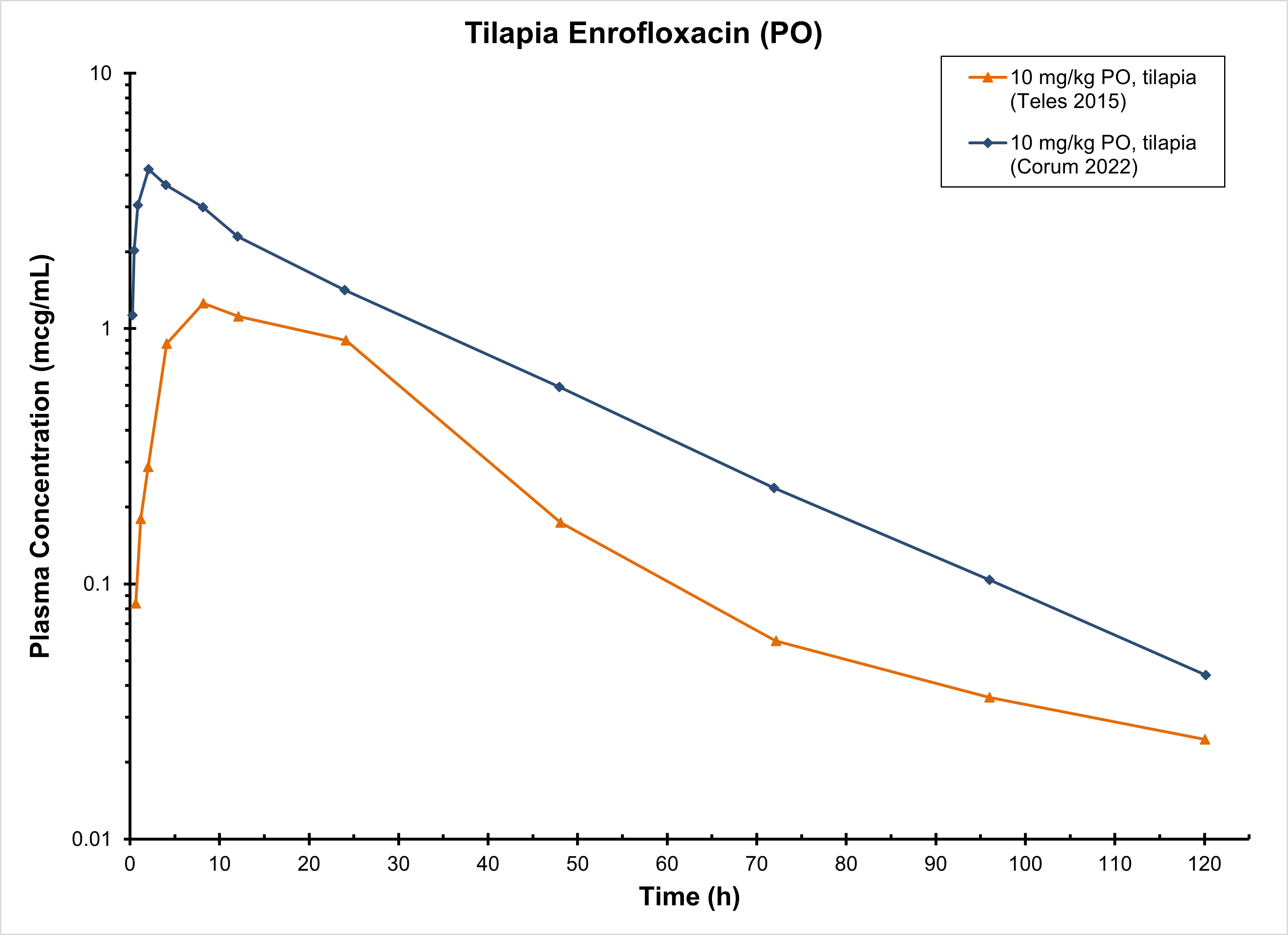 Teles, J. A., Castello Branco, L. C., Del Bianchi, M., Pilarski, F., & Reyes, F. G. R. (2016). Pharmacokinetic study of enrofloxacin in Nile tilapia (Oreochromis niloticus) after a single oral administration in medicated feed. Journal of Veterinary Pharmacology and Therapeutics, 39(2), 205–208. https://doi.org/10.1111/jvp.12257